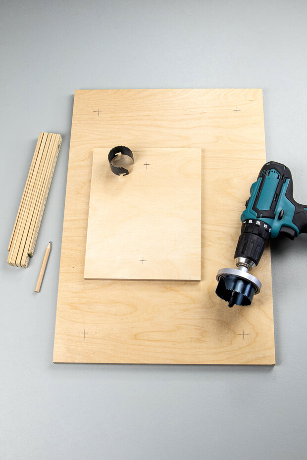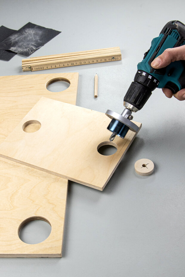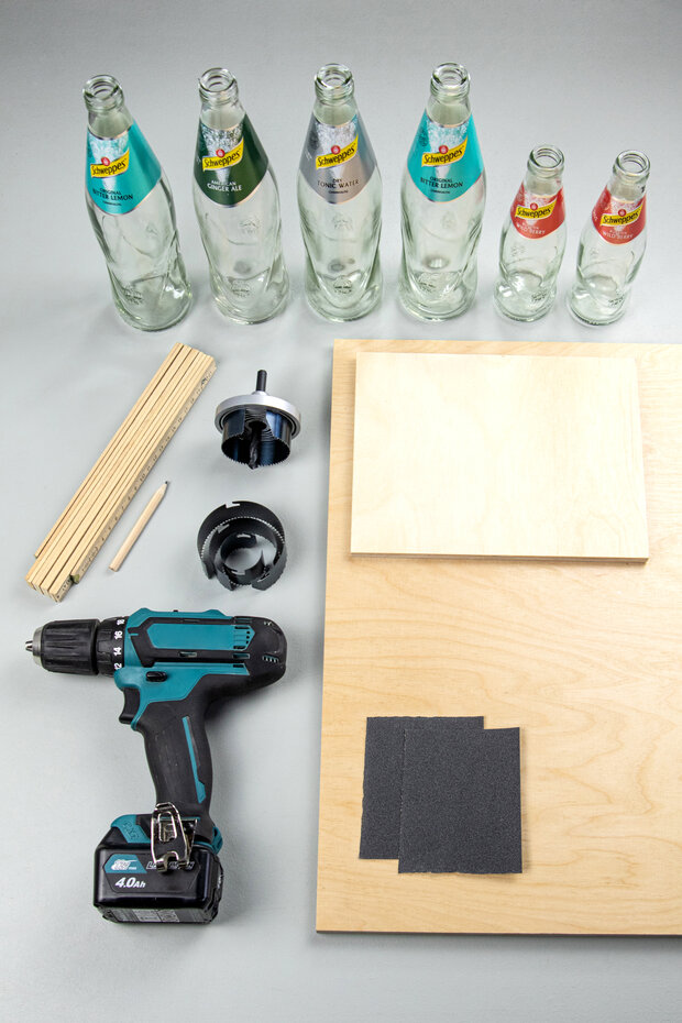 Der Durchmesser des Bohrers muss kleiner sein als der Umfang der Flasche, sodass die Bretter später auf den Flaschenhälsen liegen können. Bei der 0,5l Flasche eignet sich für die Lochsäge ein Durchmesser von 50mm und bei der 0,2l Flasche von 38mm.