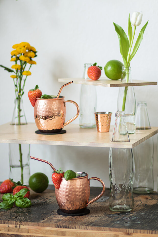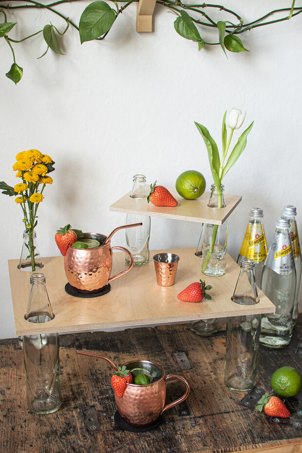 Nun muss die Etagere bzw. kleine Hausbar nur noch aufgebaut und dekoriert werden. Dazu einfach die Bretter über die Flaschen stülpen und deinen Lieblingscocktail sowie Blumen darauf abstellen.