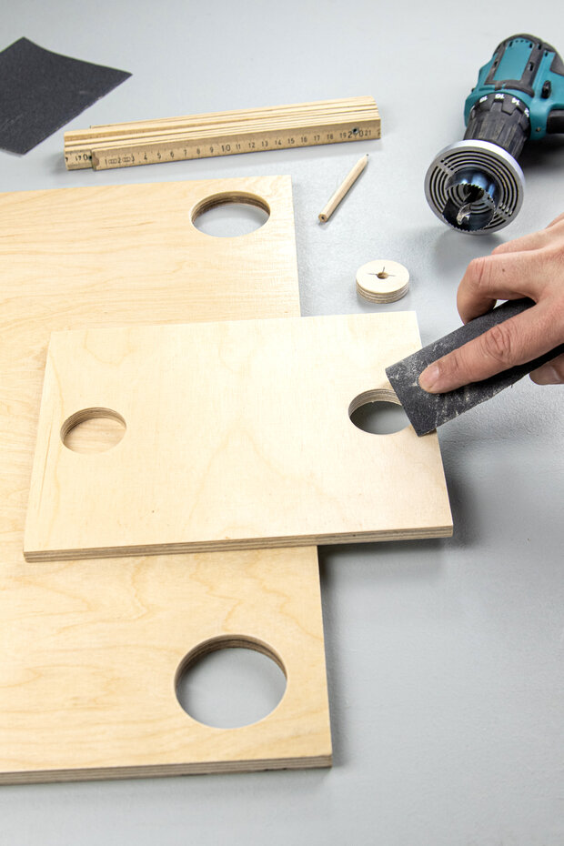Wenn alle Löcher gesägt sind, müssen die Ränder der sechs Löcher noch einmal gut mit Schleifpapier geschliffen werden. So lange schleifen bis die Kanten glatt sind.