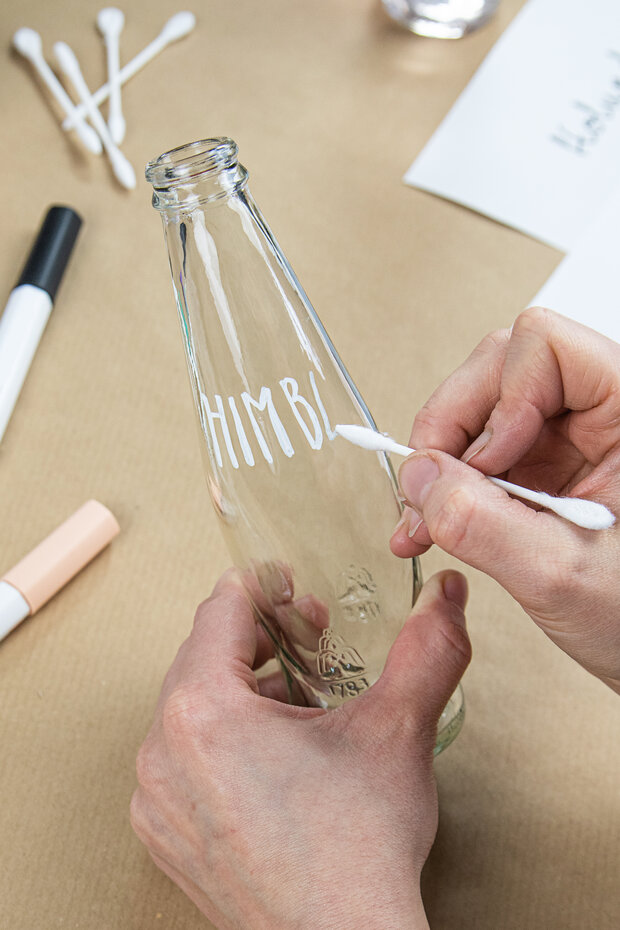 Leere Flaschen reinigen, sodass sie sauber und fettfrei sind und die Glasfarbe gut haften kann. Wenn die Flaschen für Lebensmittel verwendet werden, sollte man sie auch auskochen.