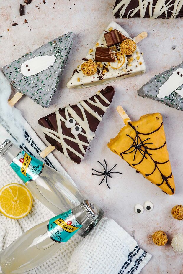 Für alle anderen sechs Stücke insgesamt 750g weiße Kuvertüre klein hacken und mit Kokosöl schmelzen. Nach Belieben Lebensmittelfarbe untermischen und die Stücke im Halloweenstil dekorieren.