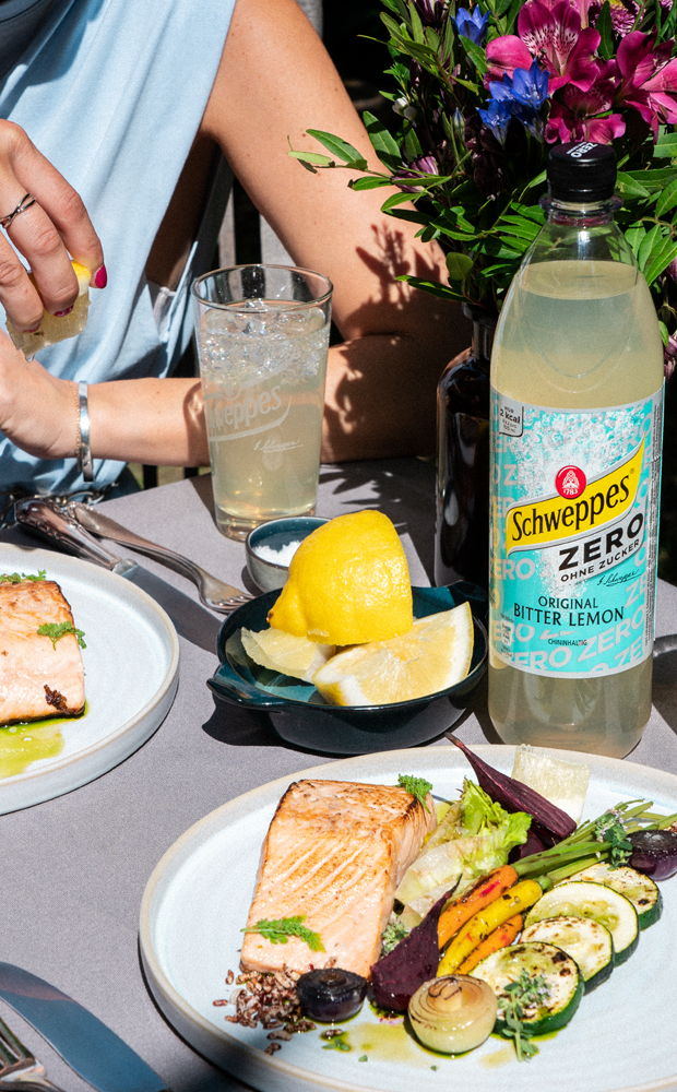 Anschließend das Essen servieren und dabei ein eisgekühltes Schweppes Bitter Lemon Zero genießen. Guten Appetit!