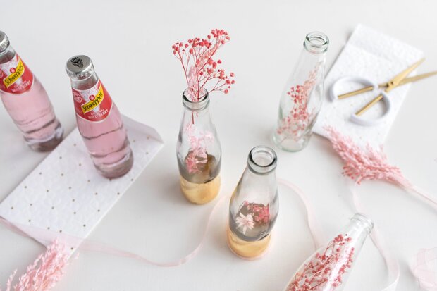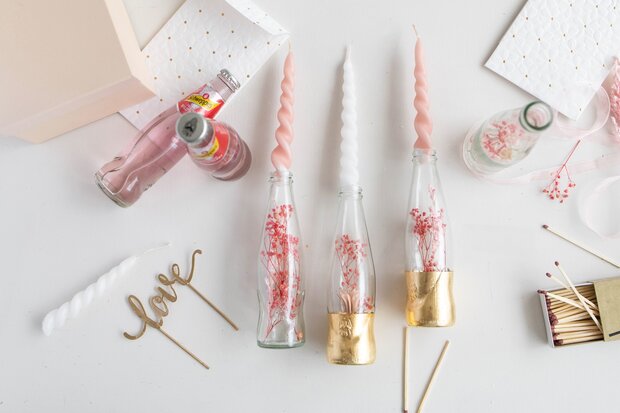 DIY Hochzeitsdeko: Trockenblumen-Kerzenständer aus leeren Glasflaschen mit Blattgold