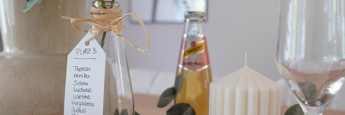 Fädele das Band durch und wickle es gleichzeitig um die leere Schweppes Flasche. Verschließe das Ende mit einem Knoten und einer anschließenden Schleife.