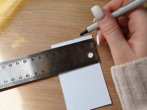 Markiere auf dem Blatt einen Abstand von 6cm. Ziehe ab den Markierungen einen geraden Strich nach unten. Messe ca. 10cm nach unten ab und ziehe eine erneute, horizontale Linie