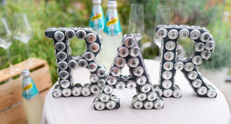 Die Buchstaben aus Pappkarton werden anschließend mit Acrylfarbe bemalt und Kronkorken beklebt. So entsteht mit wenig Material ein tolles Deko-Highlight für Eure Hochzeit.