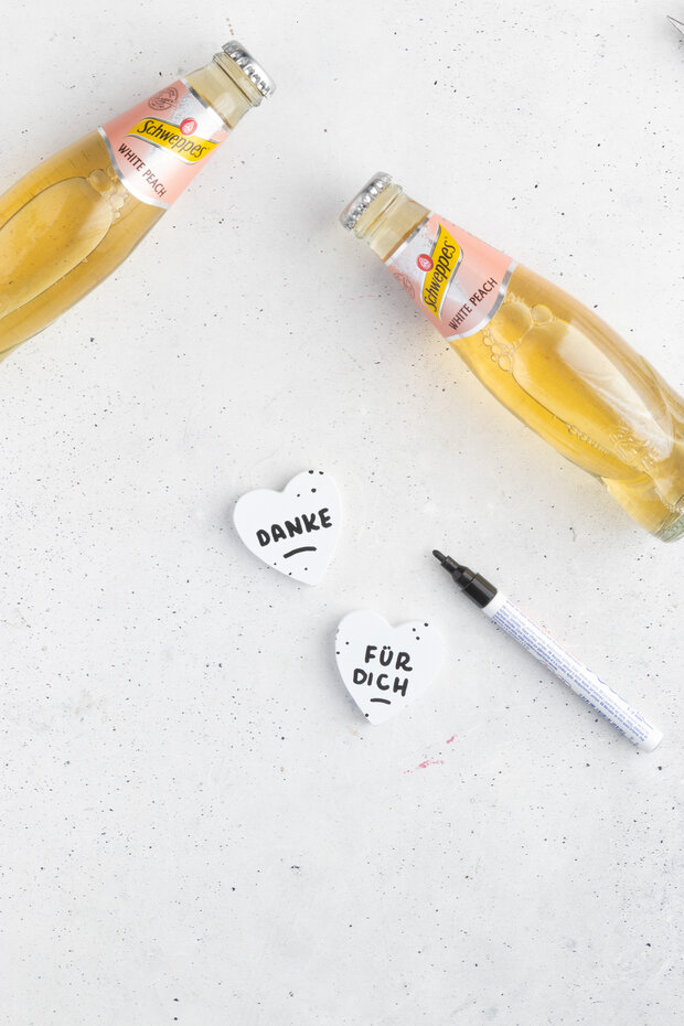 Im ersten Schritt beschriftet ihr die kleinen Herzen mit einem schwarzen Permanentstift. Hier könnt ihr zum Beispiel „Danke“ oder natürlich auch den Namen eurer Gäste notieren.