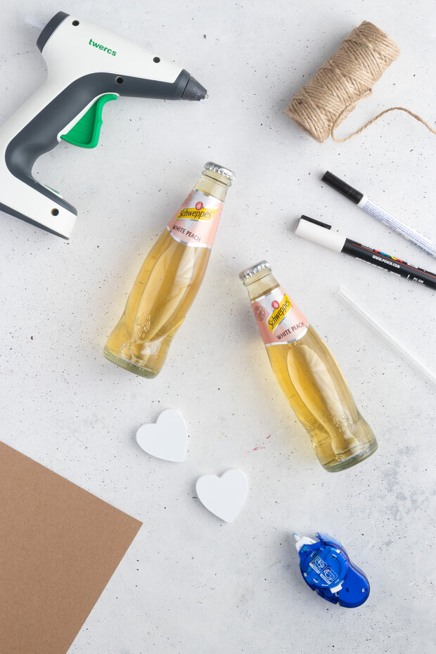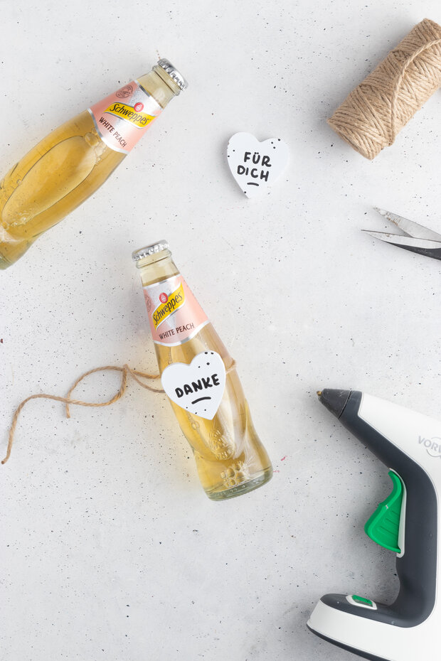 Schneidet anschließend ein Stück Garn ab und befestigt dies sowie das Herz mit einem Tropfen Heißkleber auf der Vorderseite der Flasche.
