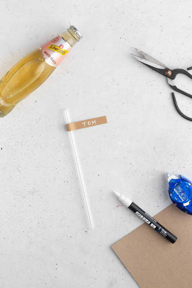 Danach nehmt ihr euch das Kraftpapier zur Hand und schneidet einen schmalen Streifen davon ab, den ihr um den Glastrinkhalm wickelt, mit etwas Kleber bestreicht und anschließend mit dem Namen eines Gastes beschriftet.