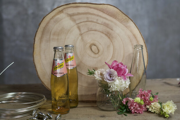 Nach Belieben können Schweppes-Flaschen und Einmachgläser an der Holzscheibe befestigt werden.