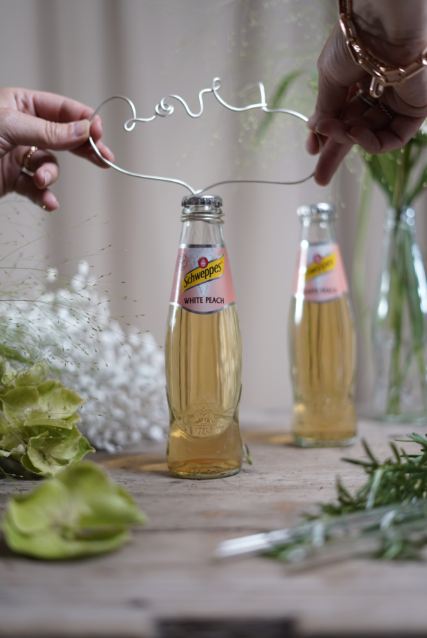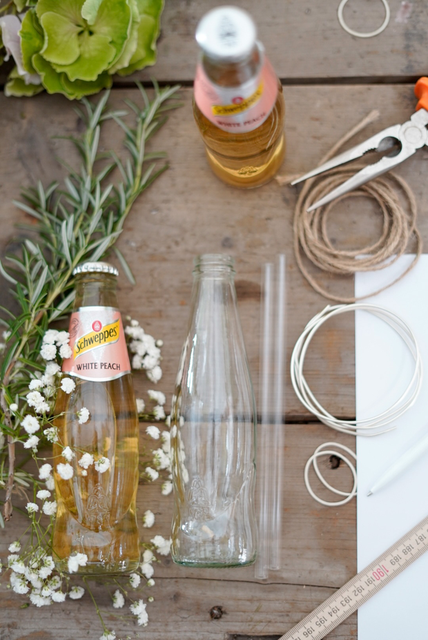 Stülpe über den Flaschenboden zwei Gummis. Befestige daran die Strohhalme und das grüne Dekomaterial. Achte darauf, dass alles gut fixiert ist.