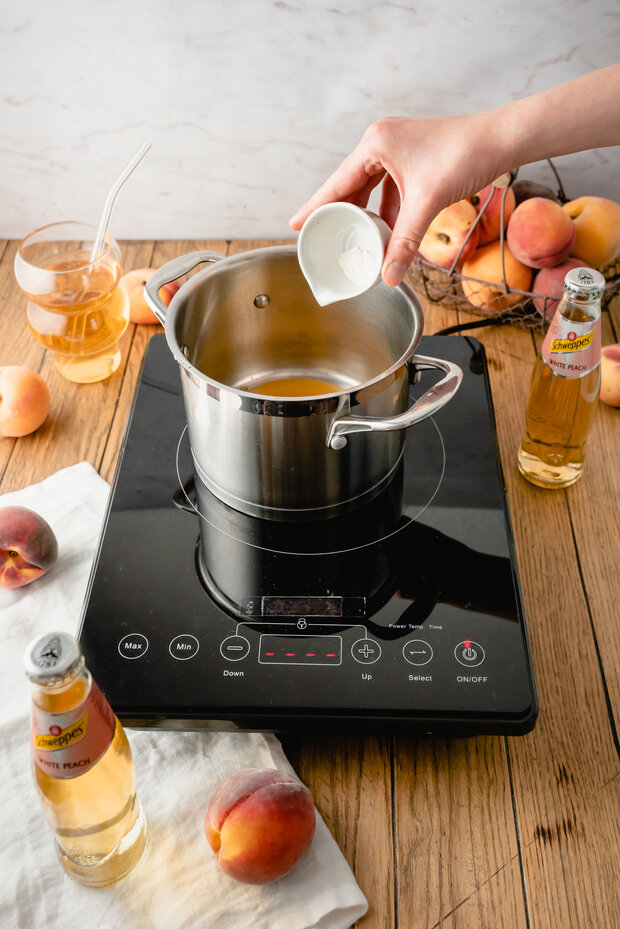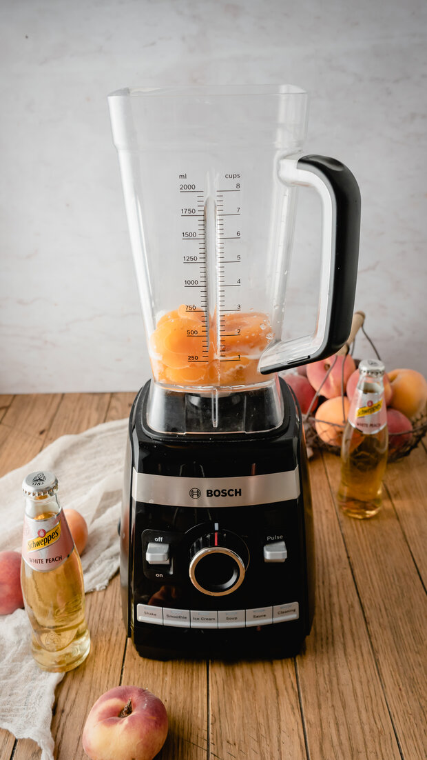 Pfirsiche zusammen mit Schweppes White Peach pürieren.