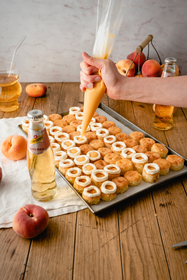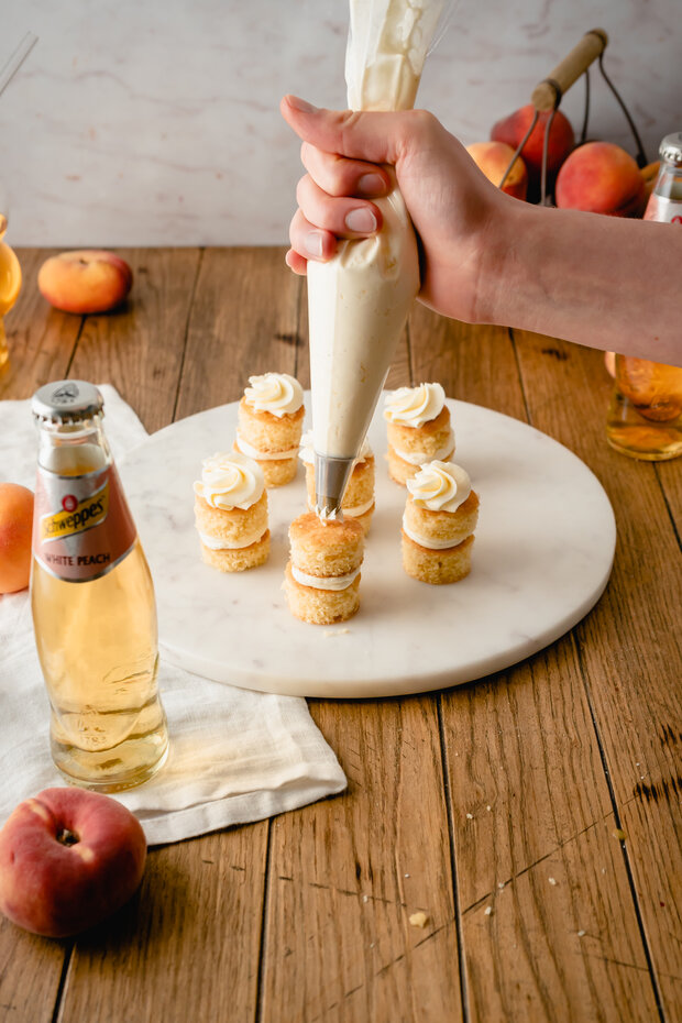 Auf der Suche nach einem passenden Dessert für den besonderen Tag? Die Mini Törtchen mit Schweppes White Peach und Pfirsichfüllung sind die perfekte süße Ergänzung für den besonderen Anlass.