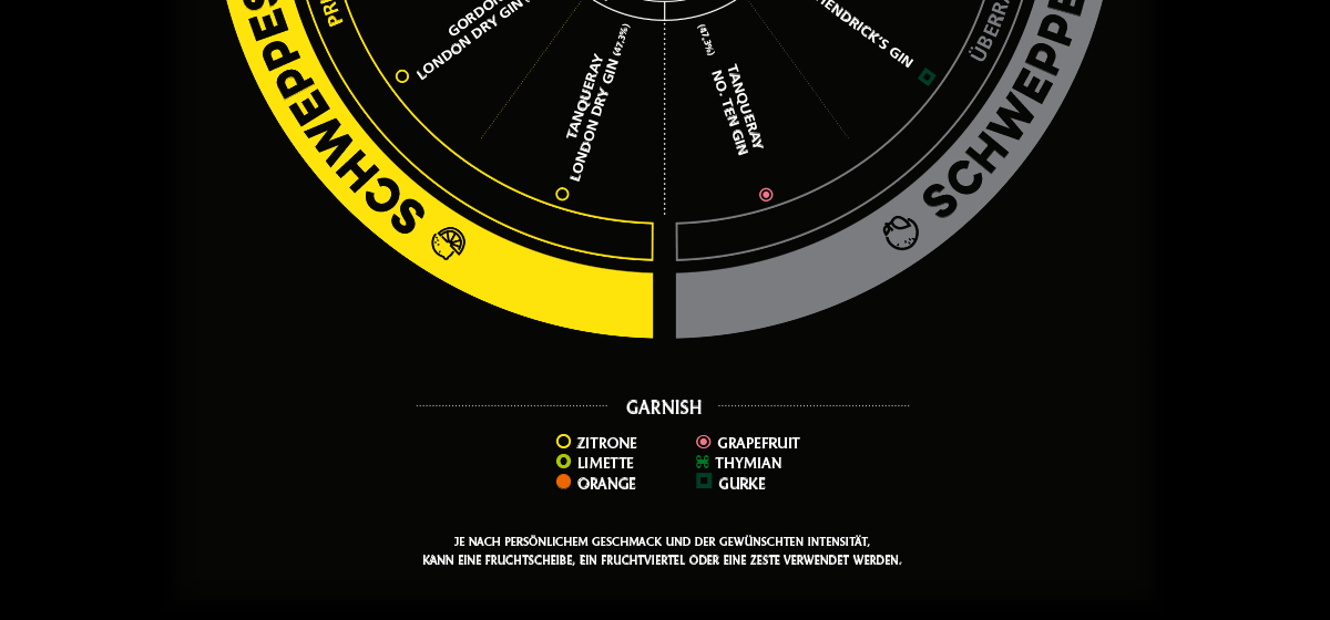 Du trinkst Tonic Water am liebsten ganz klassisch mit Gin? Da der Gin Tonic neben dem perfekten Garnish nur zwei Zutaten beinhaltet, ist es wichtig, dass beide von höchster Qualität sind. Beim Gin kann man kreativ sein: Manche mögen es bitterer, manche bevorzugen einen lieblichen Touch. Es gibt viele Gins, die sehr pflanzlich und floral sind, manche etwas süßer und fruchtiger. Am besten probiert man sich durch verschiedene Varianten um seinen Lieblings Gin Tonic zu finden. In unserem Wheel zeigen wir euch, welches Schweppes Tonic Water mit welchem Gin besonders gut harmoniert und welches Garnish den Drink ideal ergänzt. Probiert es aus!