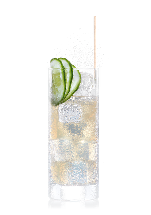 Alle Zutaten mit Eiswürfeln in ein Longdrinkglas geben und verrühren. Mit 3 Scheiben Gurke garnieren.