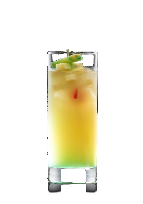 Die Zutaten zusammen mit einigen Eiswürfeln in den Shaker geben und kräftig schütteln. Ein Longdrinkglas etwa zu einem Drittel mit gestoßenem Eis füllen, die Mischung aus dem Shaker dazugeben und vorsichtig verrühren.