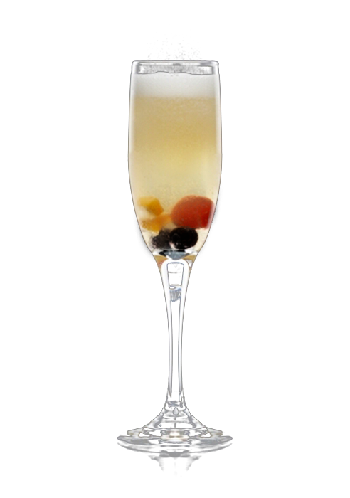 Eine Sektflöte zu ungefähr einem Drittel mit gestoßenem Eis füllen. Triple Sec, Zitronensaft und Maraschino dazugeben und gut verrühren. Kleine Pfirsichstückchen, einige Weintrauben und Cocktailkirschen in das Glas geben und je nach Geschmack mit Sekt auffüllen.